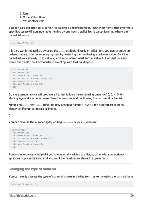 ordered list's existing numbering system by restarting the numbering at a lower value. So if the