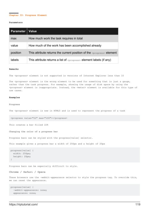 These browsers use the -webkit-appearance selector to style the progress tag. To override this,