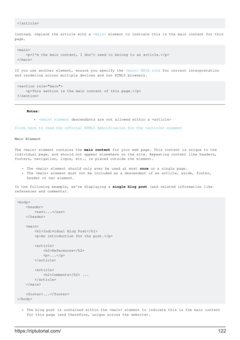 • The <main> element must not be included as a descendant of an article, aside, footer,