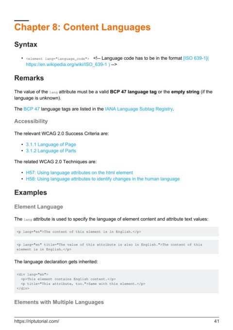 • <element lang="language_code"> <!-- Language code has to be in the format [ISO 639-1](